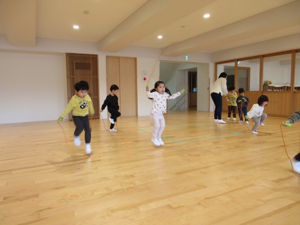 ホール遊びも大好きな子どもたち!ハンカチ落としや十字ゲーム、ボールを使った遊びなど、様々な集団遊びを楽しんでいます。また、縄跳びにも意欲的に取り組んでいます。思うように跳べないことがあっても、「練習したら上手に跳べるようになる!」という気持ちが伝わってきて、きく・ゆり組さんは、諦めずに何度も挑戦しています。ばす組さんは、そんなきく・ゆり組さんの姿をみて、「すごいね!」「がんばれ!」と目を輝かせていたり、縄跳びを貸してもらって自分たちも挑戦してみたりしています。縄を持って一生懸命ジャンプする姿は、とてもかわいらしいです♡