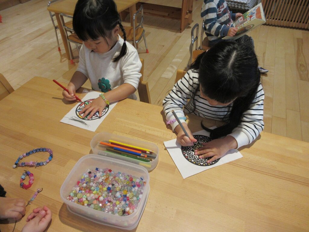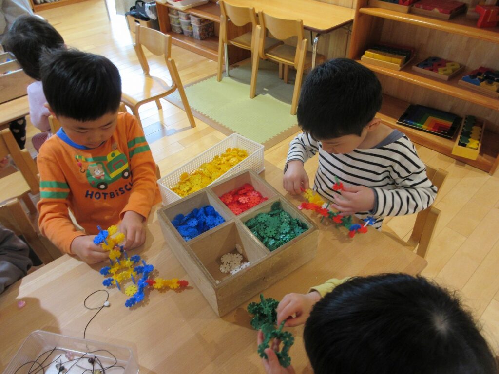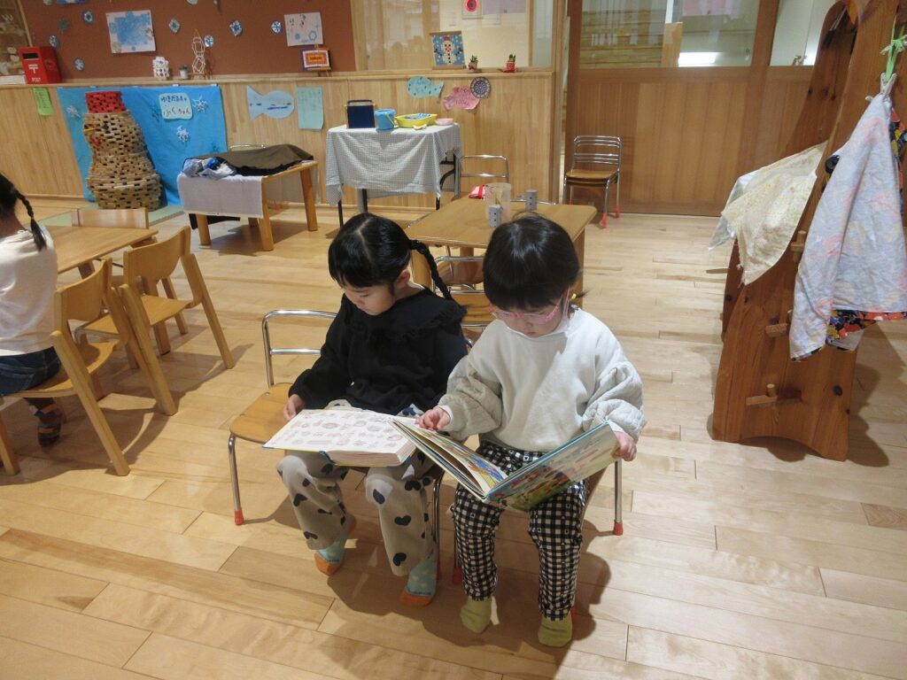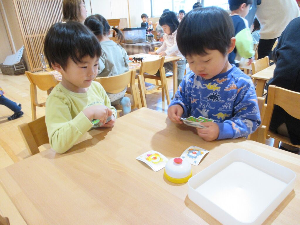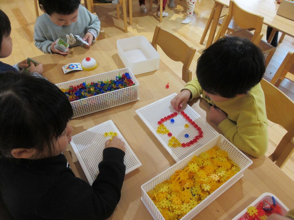 お部屋では、手先の玩具で作品作りをしたり、ままごとやゲームなど、それぞれが遊びの世界を楽しんでいます。友達と同じ遊びをしながら会話を楽しんだり、イメージを共有したりする姿も見られ、遊びの中での関わりが少しずつ深まっています。ばす組さんは、ばす組のお部屋にはなかった新しい玩具に興味を持ち、「やってみたい!」という気持ちで意欲的に遊んでいます。そんな中、「これはこうだよ」ときく・ゆり組さんが優しく教えてあげる姿も見られ、とても頼もしいです。
