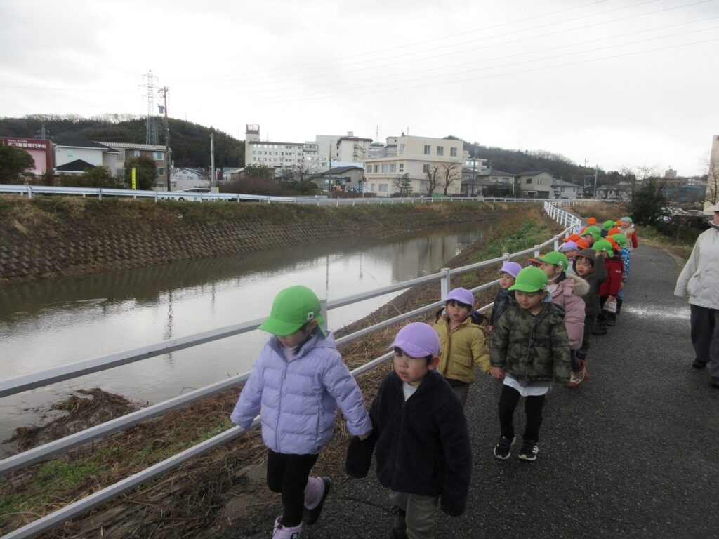 川沿いの方まで散歩をしたり、かがやき公園や城北公園に行ったりしながら、寒さに負けず元気いっぱいに遊んでいます。公園では、友達と鬼ごっこなどで思い切り体を動かしたり、落ち葉や木の実を見つけると、「こんなのあったよ!」と嬉しそうに見せに来てくれたりと、冬ならではの自然物探しを楽しむ姿もあります。こあら組さん、りす組さんもいるので、前のクラスの子と再会し、一緒に遊ぶ姿も見られ、ほほえましいです。「早く雪遊びしたいな~」と、冬ならではの遊びを楽しみにしている声も聞かれます。雪が積もった日には、みんなで思い切り雪遊びを楽しみたいですね。