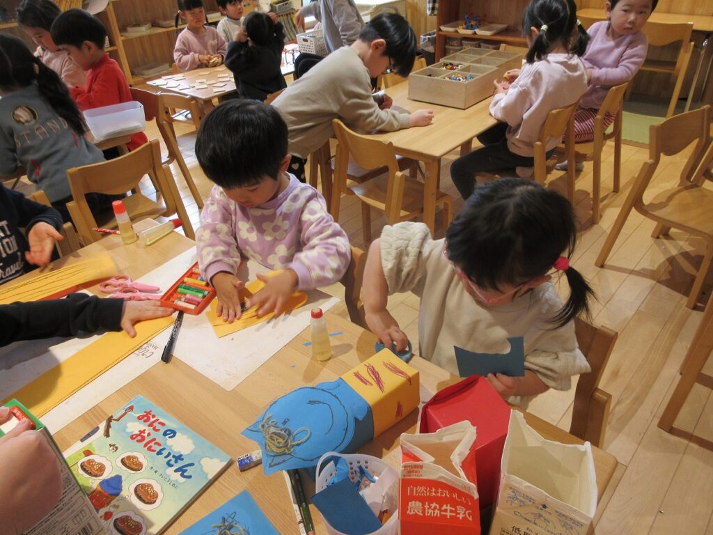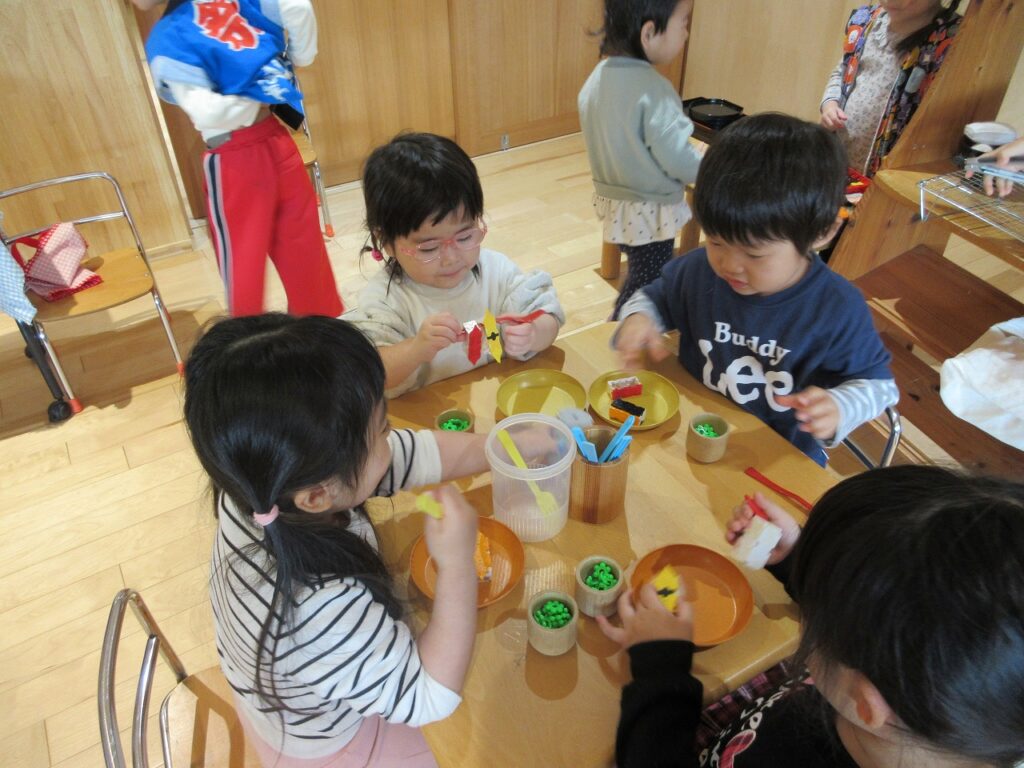 もうすぐで節分ということで、鬼の作品作りや製作を楽しんでいる子どもたち。鬼が出てくる絵本を見て、イメージを膨らませながらLaQなどで鬼作りに挑戦していました。完成すると、友達同士で見せ合い、嬉しそうにやり取りをする姿が見られました。牛乳パックを使った鬼の製作では、「どんな鬼さんにしようかな~」と考えながら、鬼の顔や鬼のパンツの色や模様を工夫し、思い思いの鬼を作り上げていました。