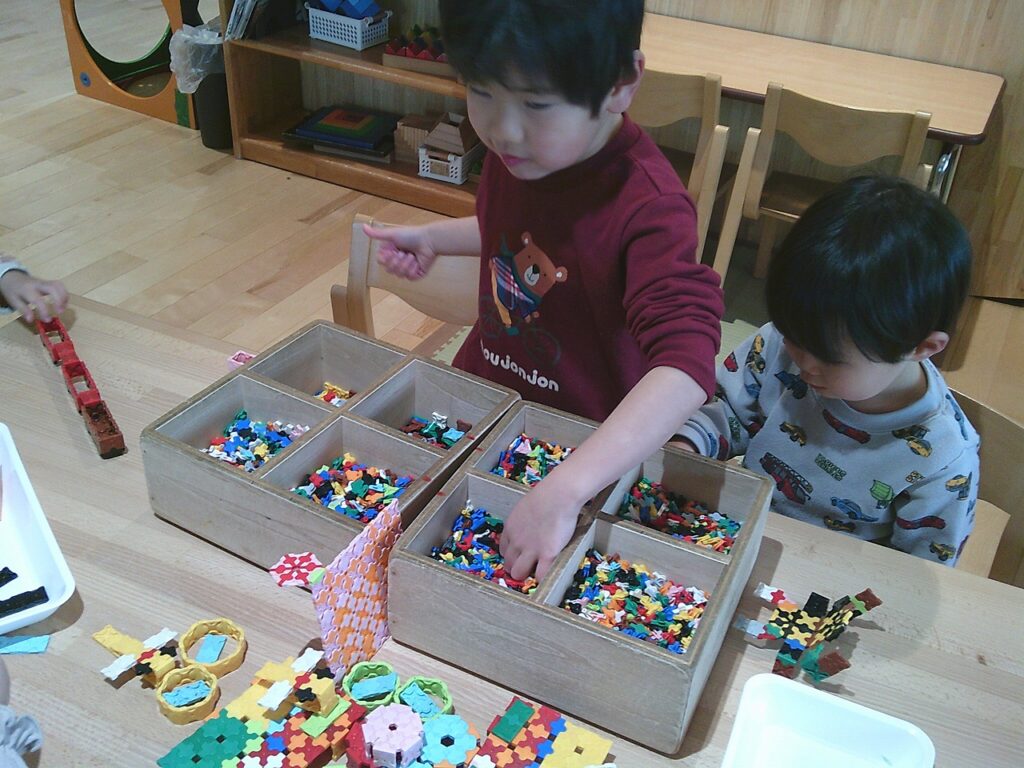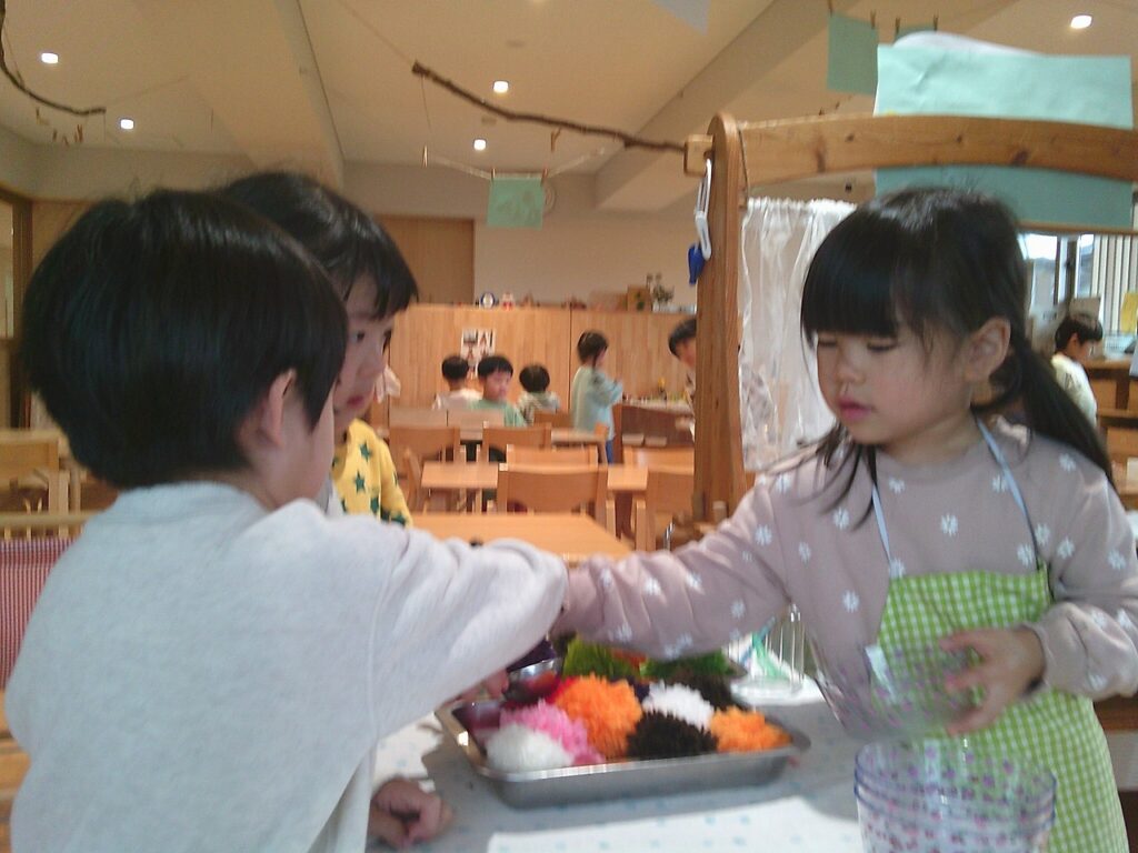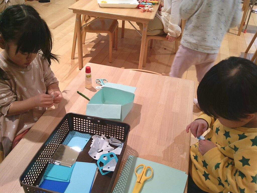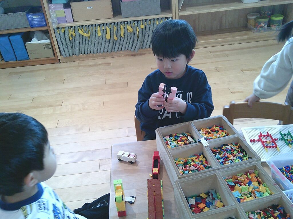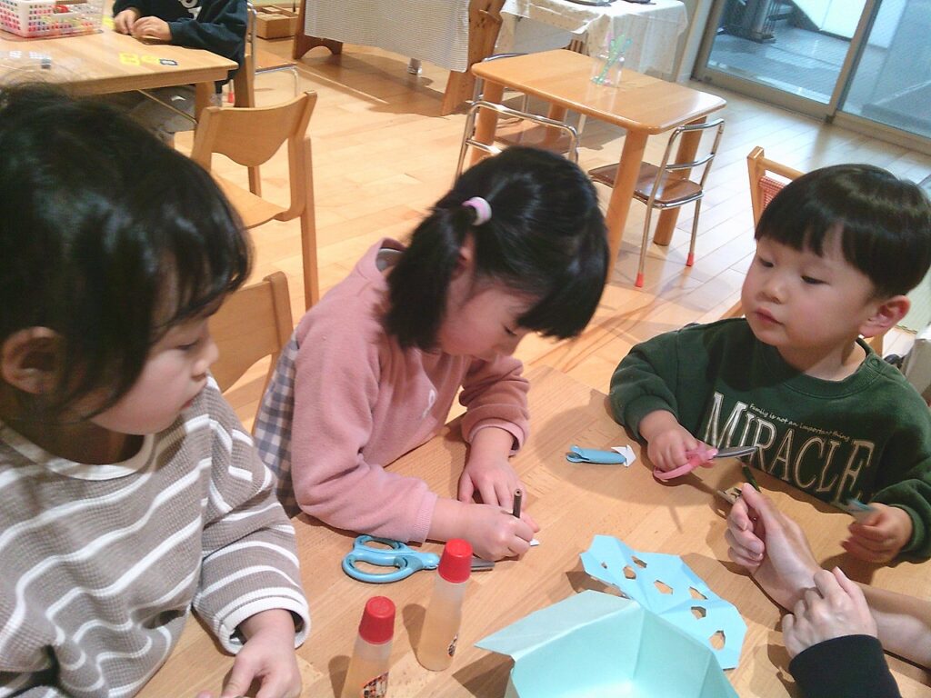 ばす組さんは、お部屋にはなかった玩具を手に取り「やろう~?」と友達を誘って遊んでいます。きく組やゆり組さんもお互いに友達を誘い合ってしたい遊びを楽しんでいます。また、製作が好きな子が多く、製作をしていると「やりたい!」と言って雪の結晶を作ったり、「こんなのもいいんじゃない?」と自分で考えながら作るオリジナルの雪の結晶ができたりと楽しそうです♪