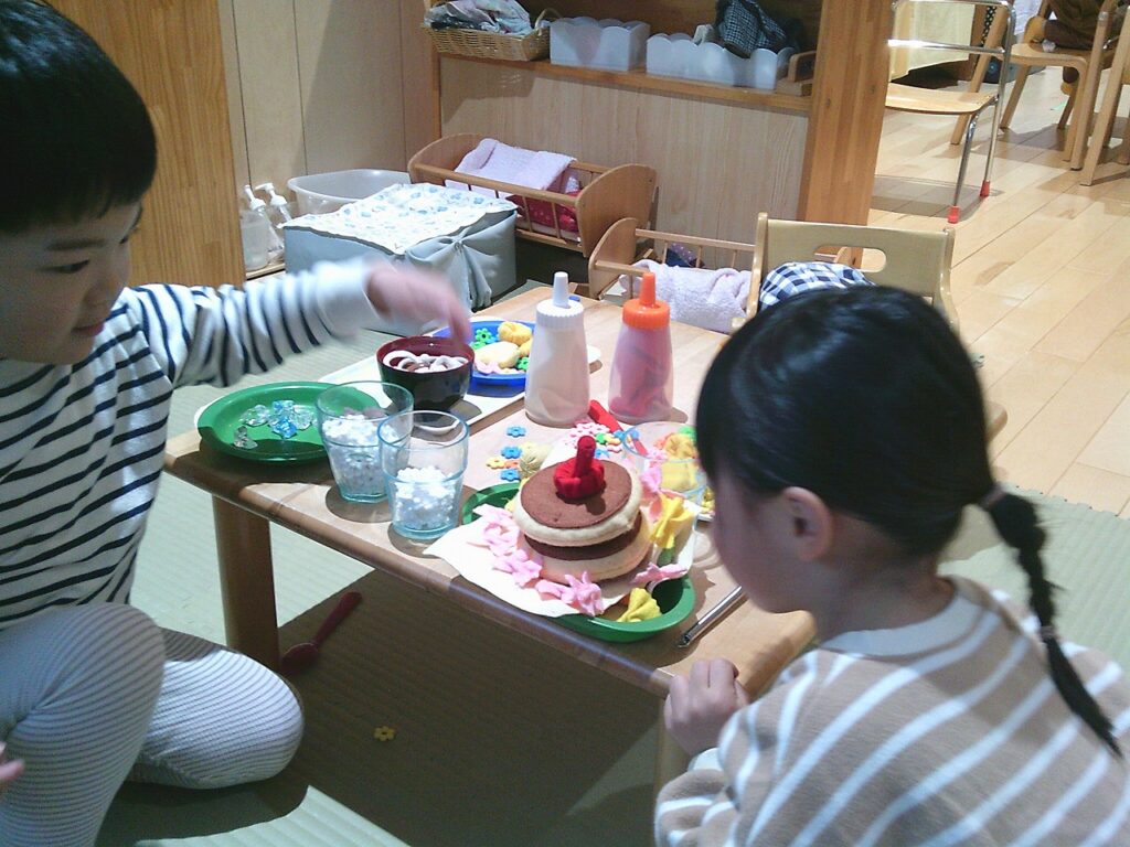 絵本の時間に何のお店屋さんがしたいのかみんなに聞いてみると、「アイスが食べたい!」という子が多かったので、アイス屋さんを開くことにしました。しかし、「今は冬だからアイスを食べたら寒いよね」という子もいたので、「それだったら温泉に入ってアイスを食べたらいいんじゃない~?」ということから、こあらぐみ温泉もオープンしようとなりました。アイス屋さんができると、いろんな味があるので、違うフレーバーを選ぶのに何度も通う子もいれば、毎回同じ味を選ぶ子など、個性が出ており面白いです♪温泉も人気で、特に外から帰ってくると体を温めるために入っていますよ!