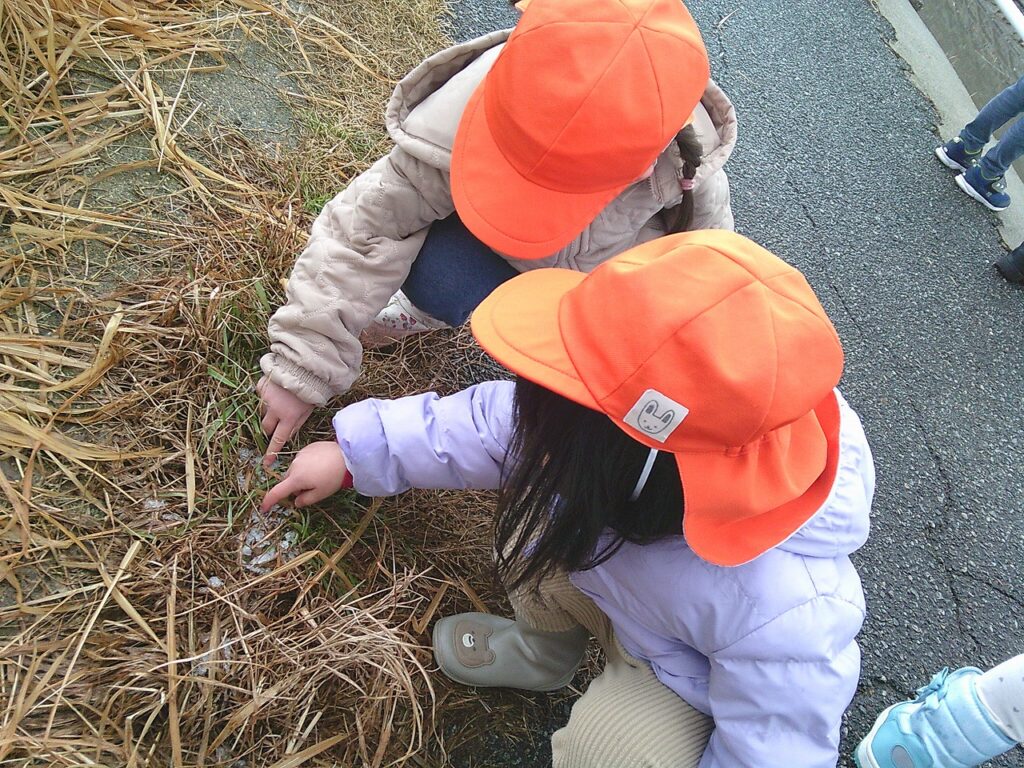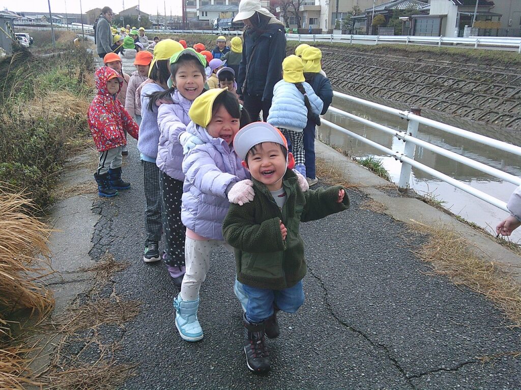 雨や雪が降っていない時には、近くの公園や川沿いへ散歩に行っています。雨や雪などが続き、久しぶりに公園に行けた日には、「やったー!」と大喜びの子ども達!公園では縄跳びやケイドロなど体を動かして遊ぶことを楽しんだり、落ち葉や雪などを見つけたりと各々楽しんでいます。
