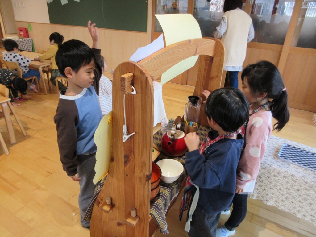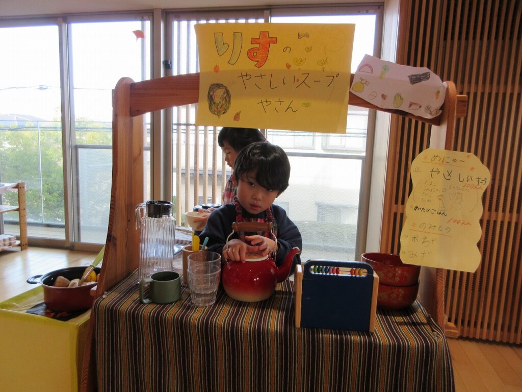 お散歩から帰ってきたある日「あったかいものが食べたいよ~!」という声から『りすぐみやさしいスープ屋さん』がオープン!名前を決めるときにも、ゆりぐみさんを中心に「風邪につよいスープ屋さん」「りすぐみみんなのスープ屋さん」などなど可愛らしいアイディアをたくさん出してくれ、1つに絞るのに苦労するほどでした。子どもたちの自由で豊かな発想に日々刺激をもらっています!