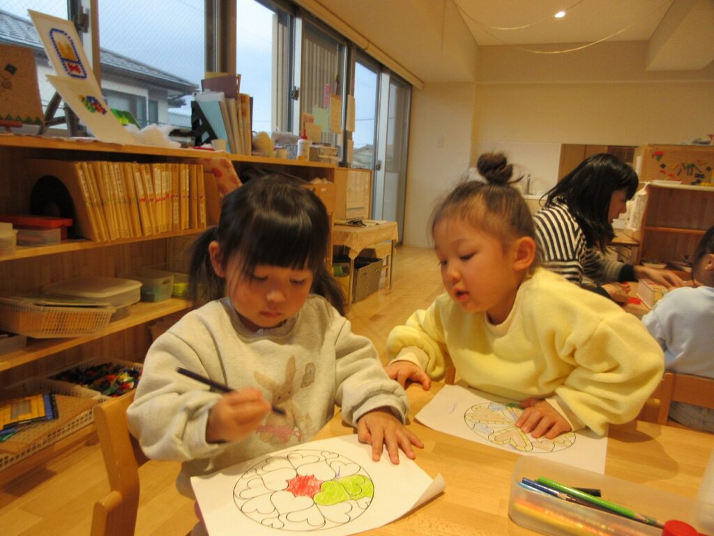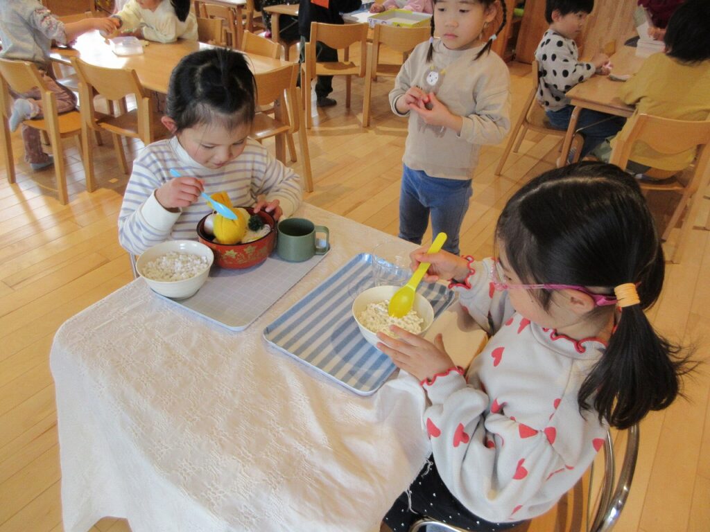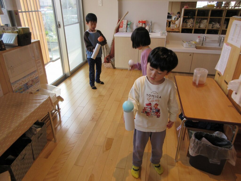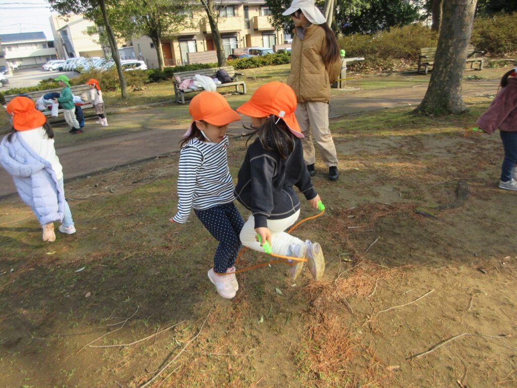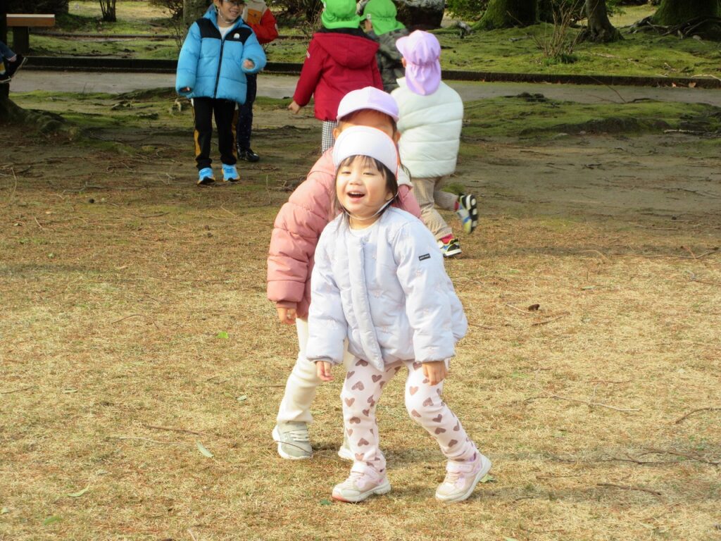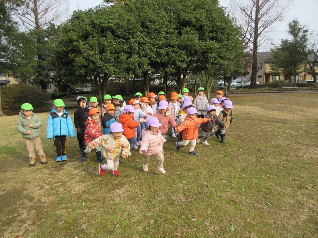 新しい年を迎え、クラスやお友達、気持ちも新たにりすぐみがスタートしました。ばすぐみのお友達も、時にお兄さんお姉さんに助けられながら、一緒に遊んだりと楽しそうに過ごしている姿にほっこりします。きくゆりさんは、またひとつ心も大きく成長し、さらにたくましく感じられる今日この頃です。戸外では、身を切るような寒さが続く中、今季はまだ雪が多く積もっていないため、子どもたちは雪遊びを心待ちにしています。お散歩へ出かけると「さむいからジャンプする!」「ぜんぜん寒くないよ~!」と寒さに負けず、元気いっぱいに伸び伸びと遊んでいます。気温に配慮しつつ、気持ちの良い天気や雪が積もった日にはできるだけ戸外へ出かけ、冬ならではの経験やいろいろな遊びを楽しんでいきたいと思います♪