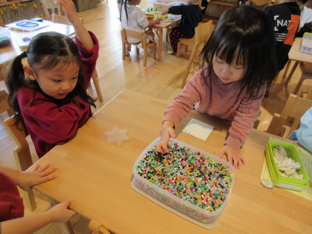 アイロンビーズで星をつくるよ!わたしは雪だるまがいいな!