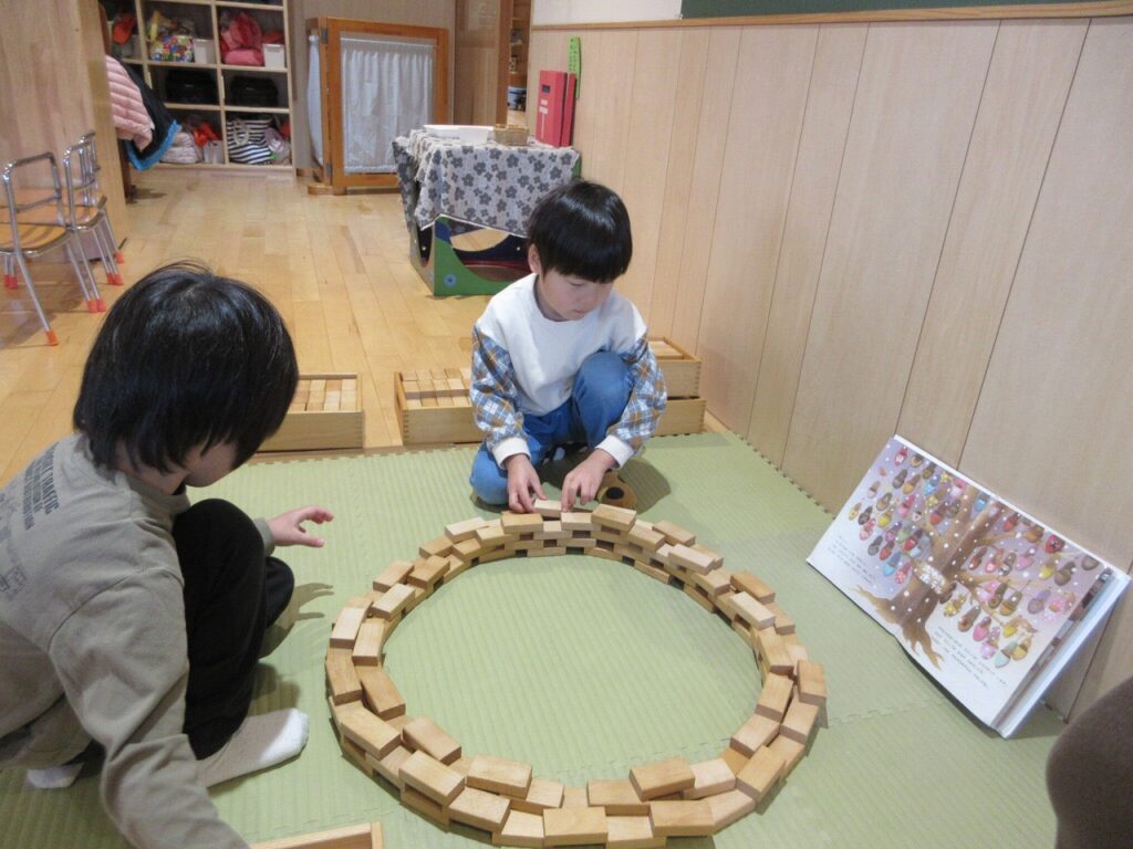 絵本の時間に読んだ『ポカポカホテル』の絵本から、りすぐみでも『ポカポカホテル』を作って動物たちが休めるようにしたいねと話が広がり、白木の積み木を使って作ってみることにしました。