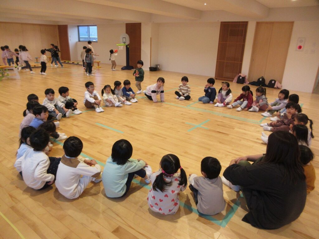 外に出られない日には、ホールで十分に身体を動かしています。「やった~!ホールも行きたかった!」とホールで遊ぶことも楽しみな子どもたち。ハンカチ落としに十字ゲームと様々な集団遊びを楽しんでいます。先日は、優しいお友達も多いので、ハンカチ落としで後ろのハンカチに気づいていないお友達に、咄嗟に教えてあげようとして「あっ!言っちゃいそうだった!」と慌てて口を押さえる姿が可愛かったです♡
