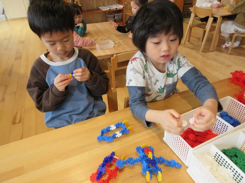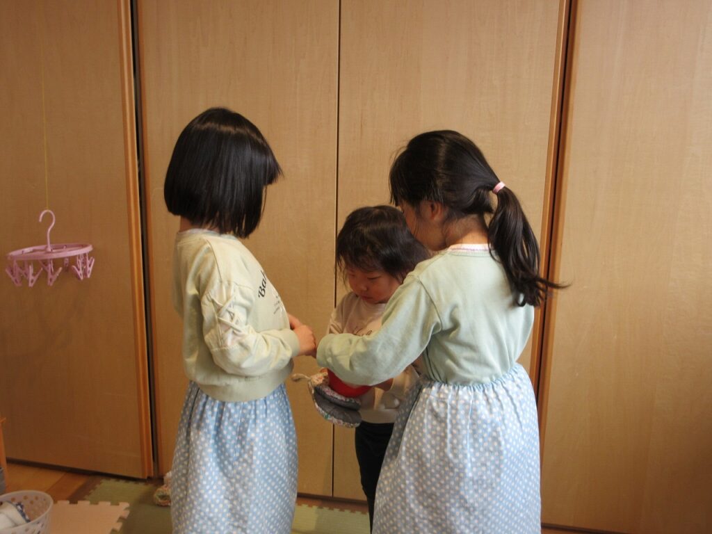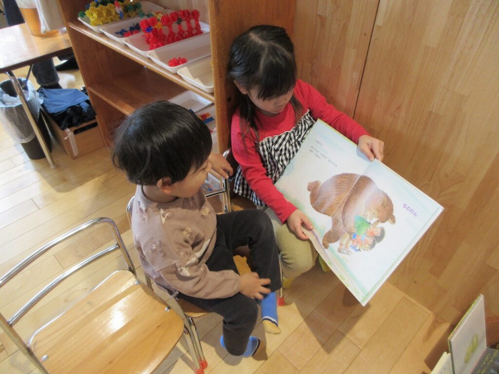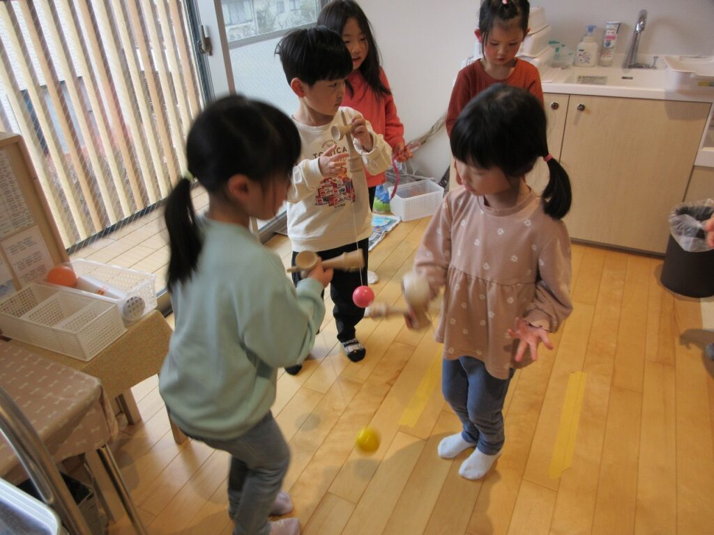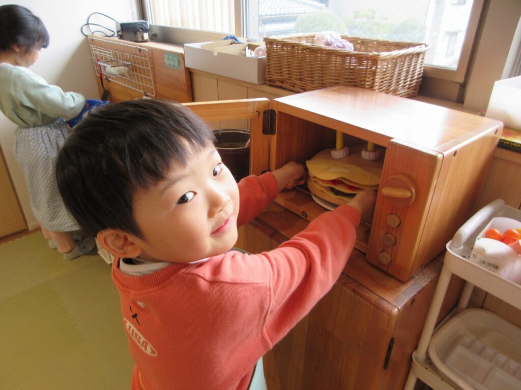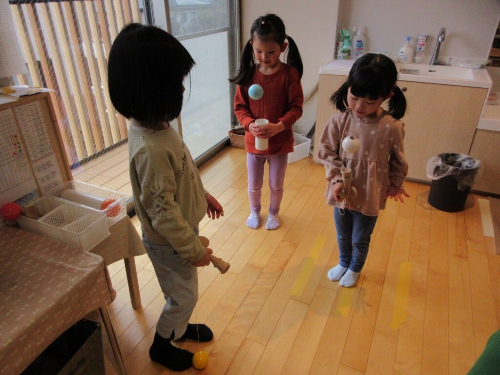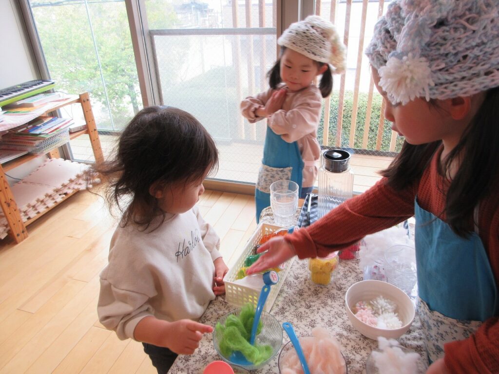 お部屋では、ままごとにお店屋さんにゲームに製作にと様々に遊んでいます!興味も意欲もたっぷりで「次はこれしよ!」「終わったらこれね!」と誘い合う声が聞こえてきます♪ ばすさんも、お兄さんお姉さんに気にかけてもらいながら、伸び伸びと遊んでいますよ。ばすさん・きくゆりさん双方にとって良い刺激のようです!「かっこいいな~」という憧れの気持ちも大きいようで「私もやってみたい!〇〇ちゃん教えて!」と遊びや生活の中から自然と輪も広がっていて、嬉しく思います!「一緒にしようよ!」「手伝ってあげよっか?」ときくゆりさんの包容力は無限大です!