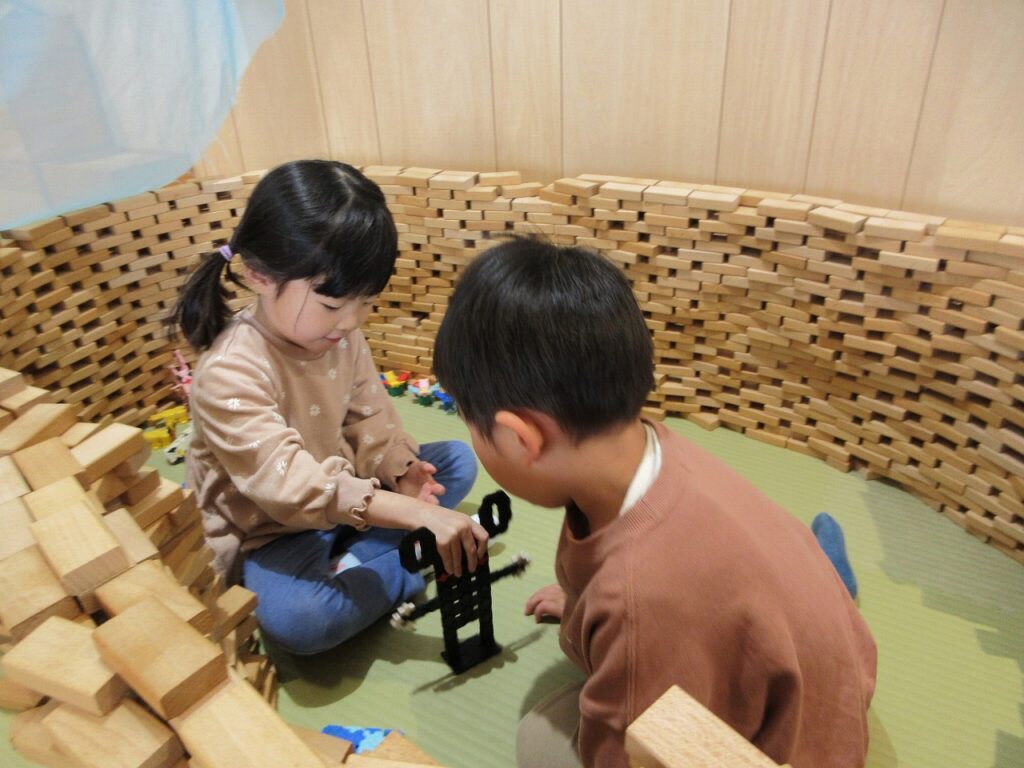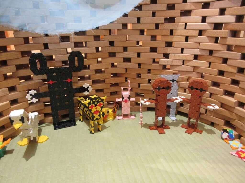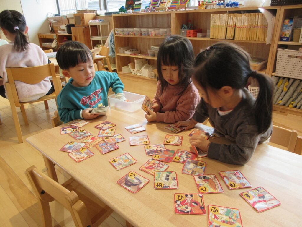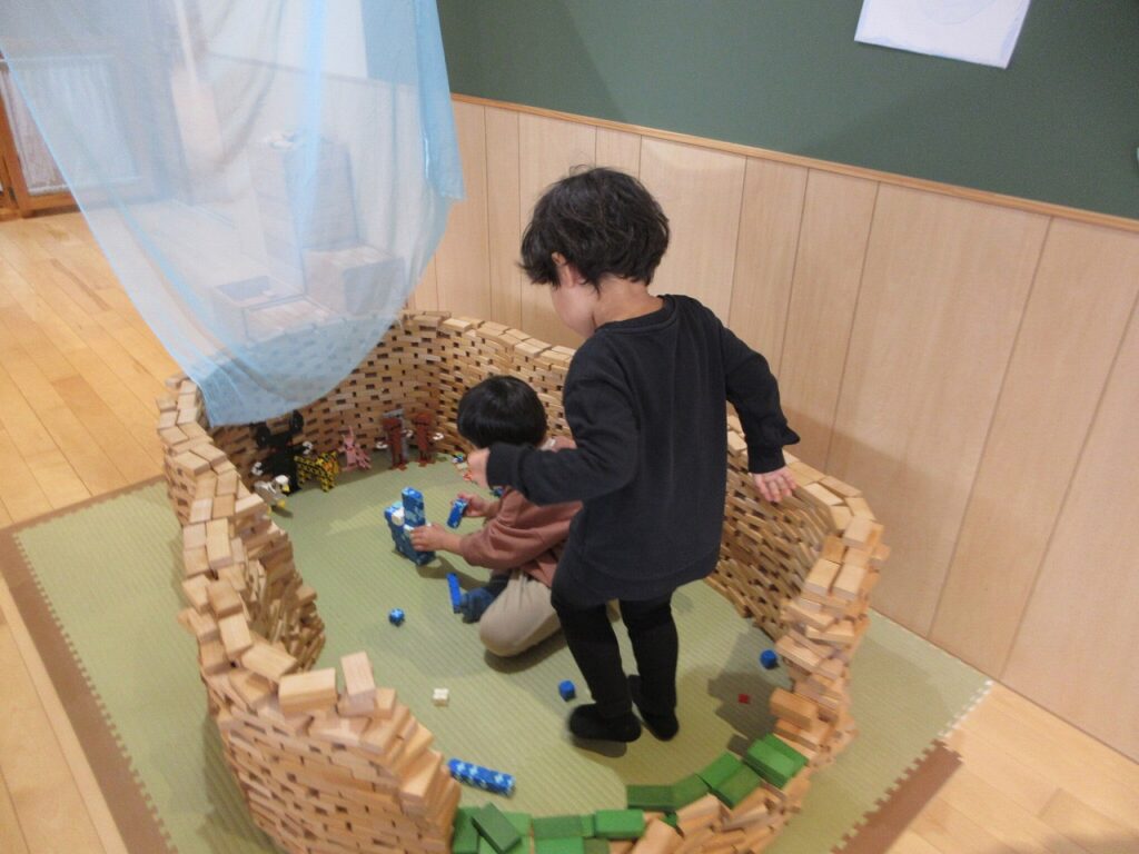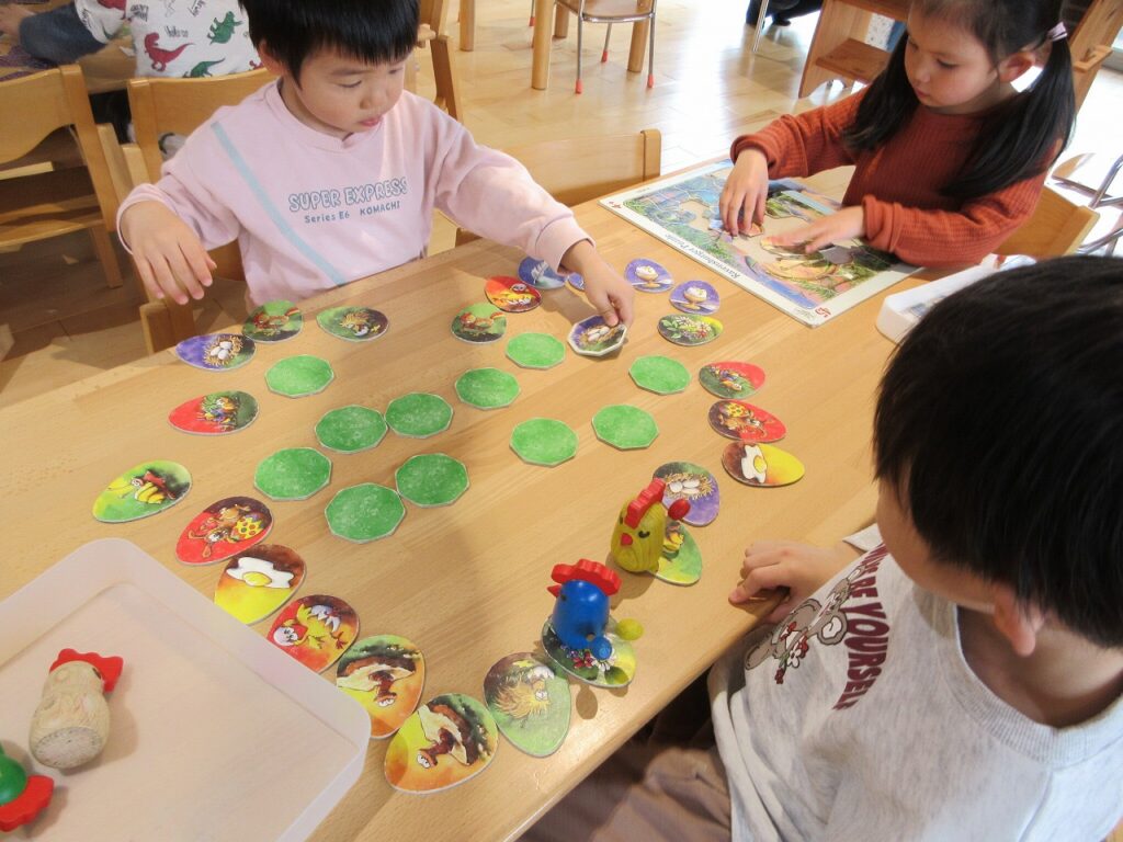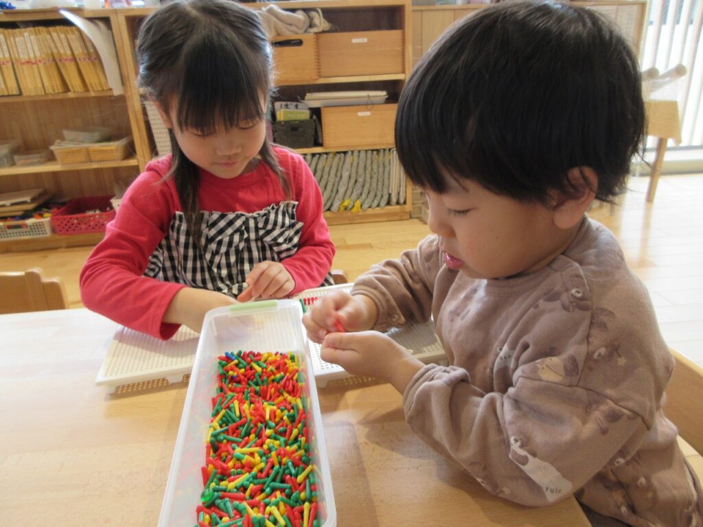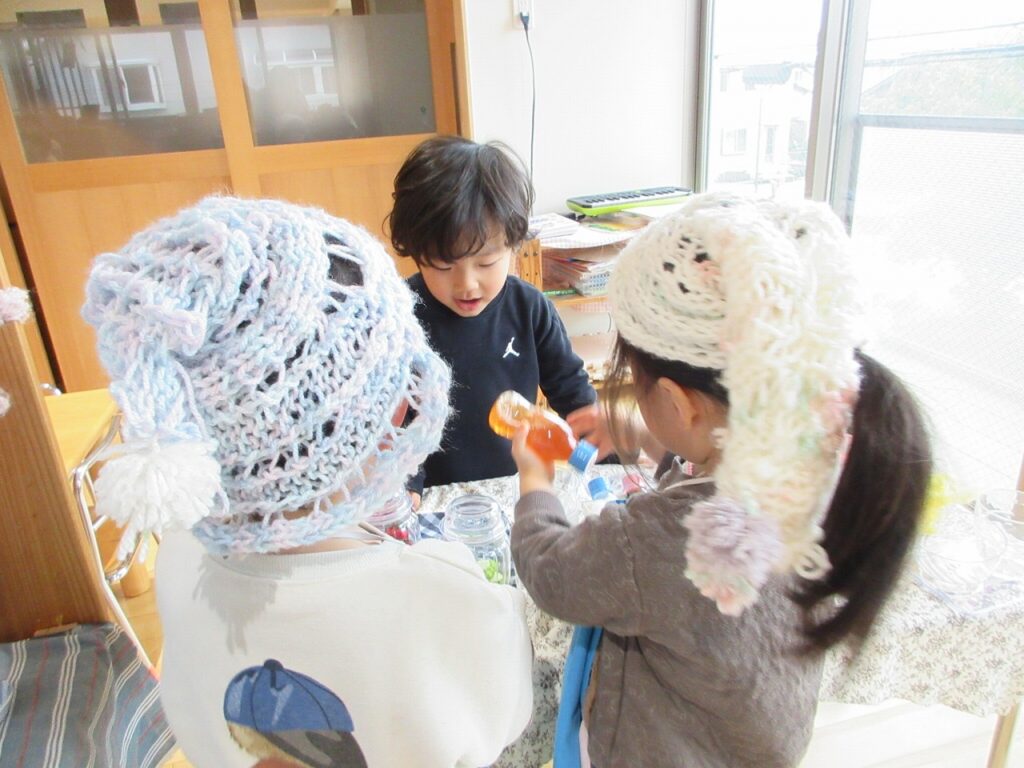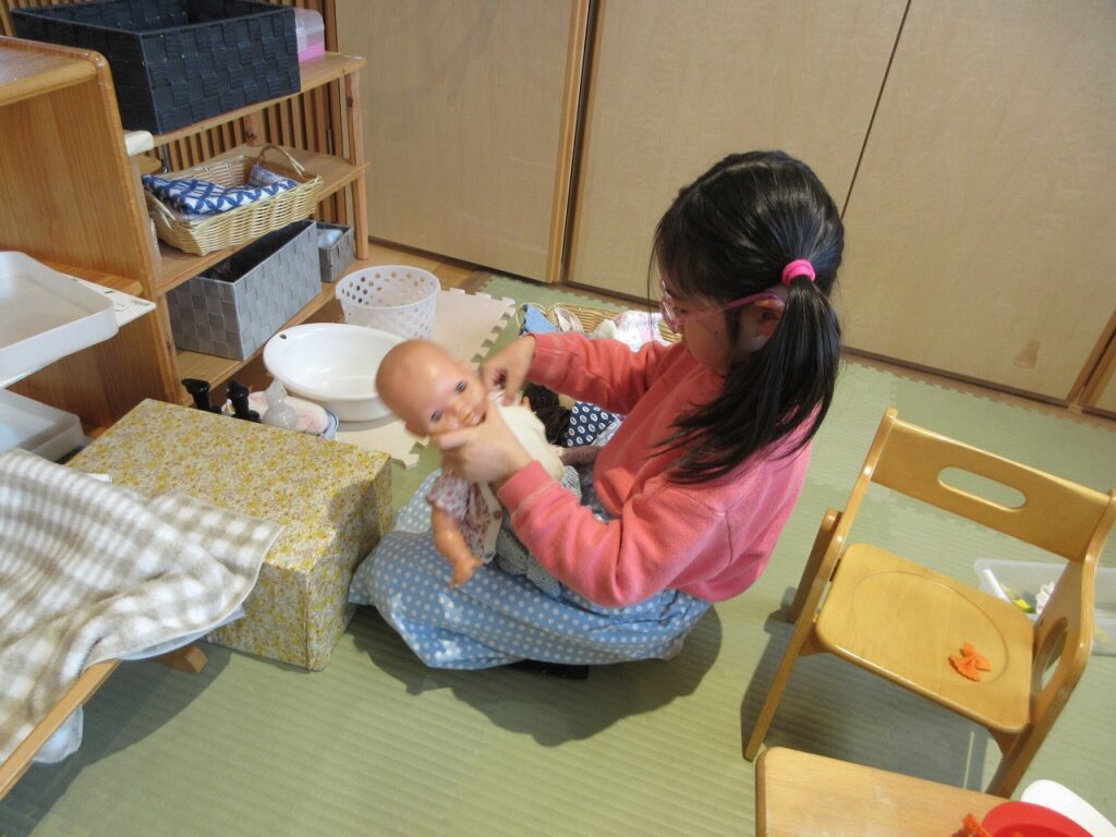 お部屋では、ままごとにお店屋さんにゲームに製作にと様々に遊んでいます!興味も意欲もたっぷりで「次はこれしよ!」「終わったらこれね!」と誘い合う声が聞こえてきます♪ ばすさんも、お兄さんお姉さんに気にかけてもらいながら、伸び伸びと遊んでいますよ。ばすさん・きくゆりさん双方にとって良い刺激のようです!「かっこいいな~」という憧れの気持ちも大きいようで「私もやってみたい!〇〇ちゃん教えて!」と遊びや生活の中から自然と輪も広がっていて、嬉しく思います!「一緒にしようよ!」「手伝ってあげよっか?」ときくゆりさんの包容力は無限大です!