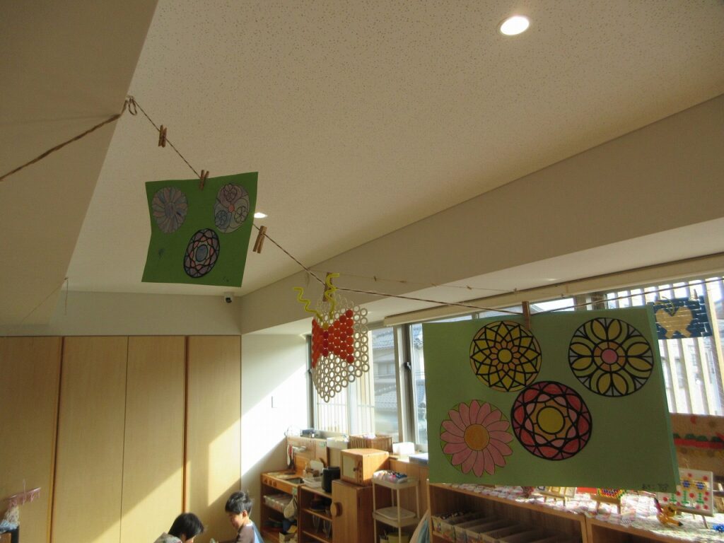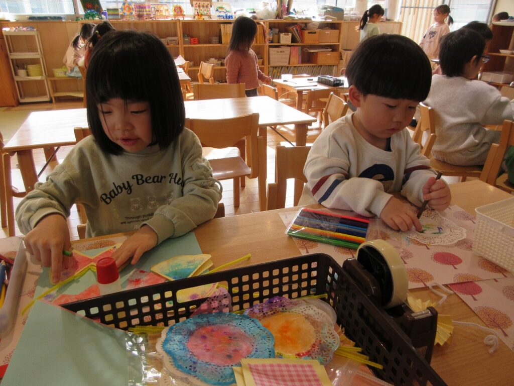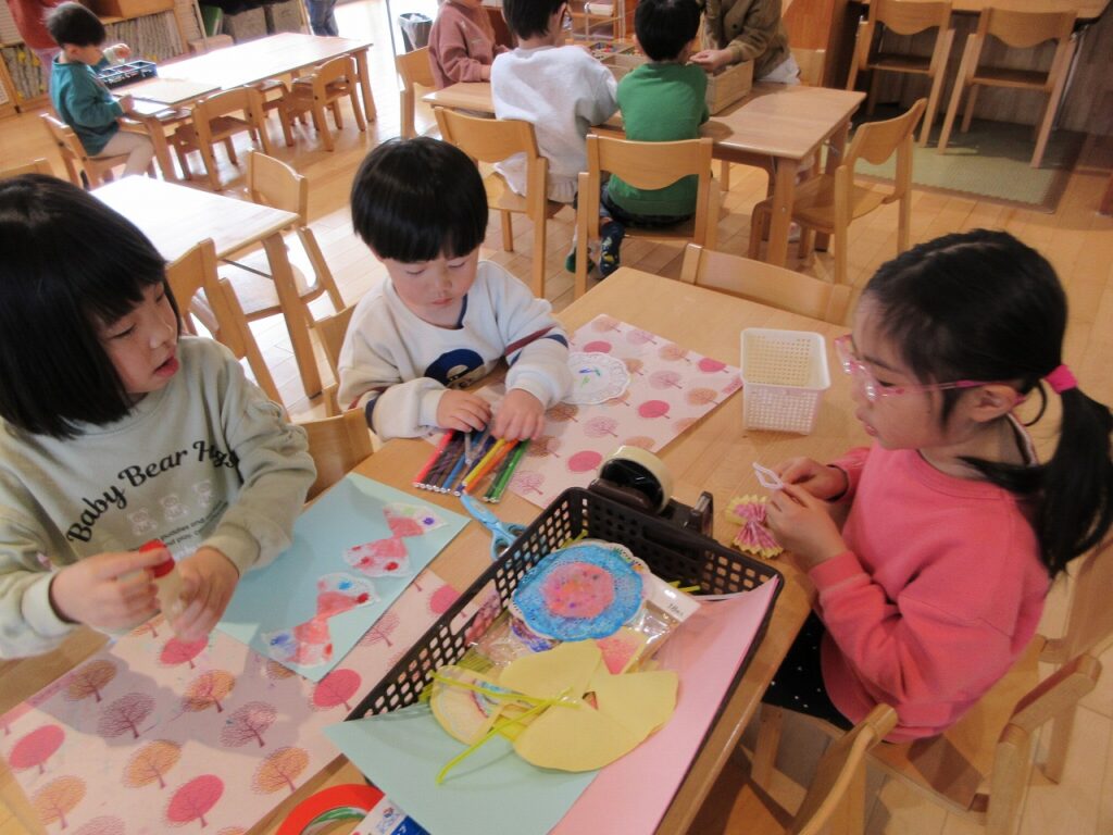 部屋では、春にまつわる製作などを始めています。虫が大好きな子が春の虫を飛ばし、植物に興味がある子は花を咲かせたりしていますよ。子どもたちの作品は個性にあふれています。「ここを曲げたら飛んでるみたいじゃない?」などと工夫も凝らしていますよ!