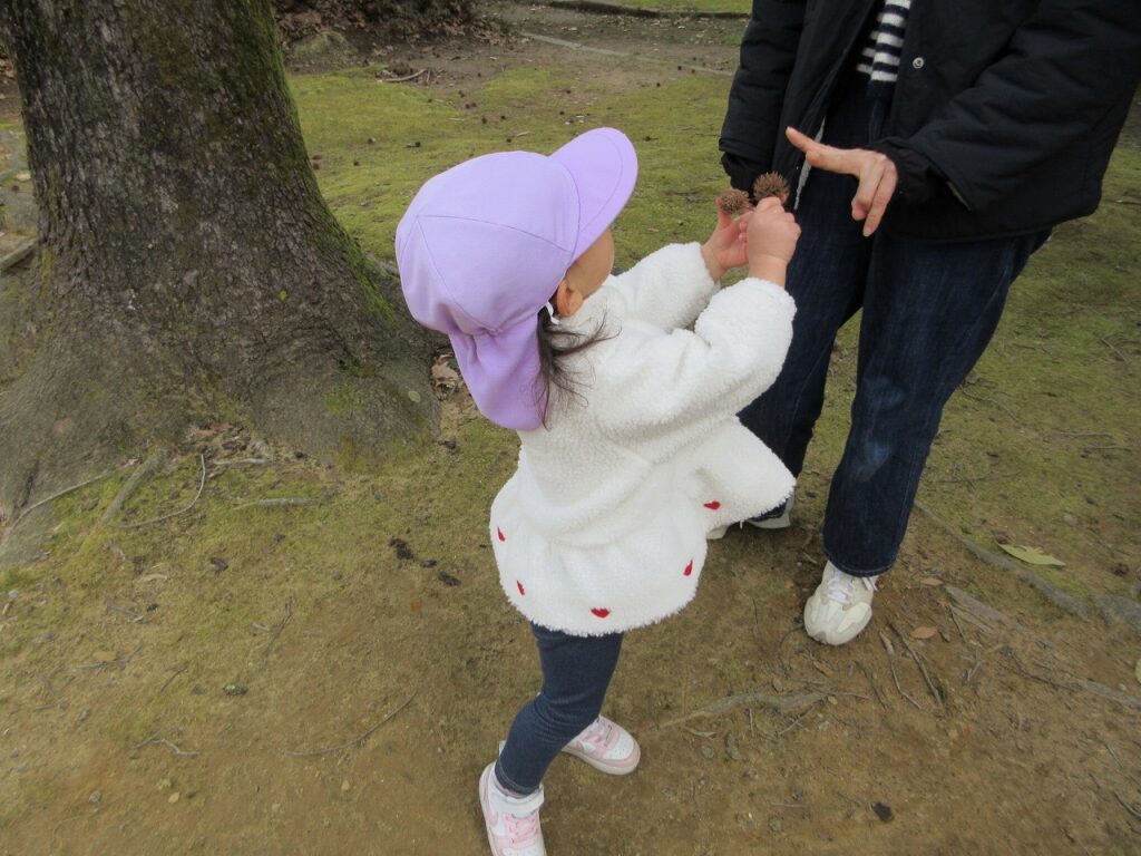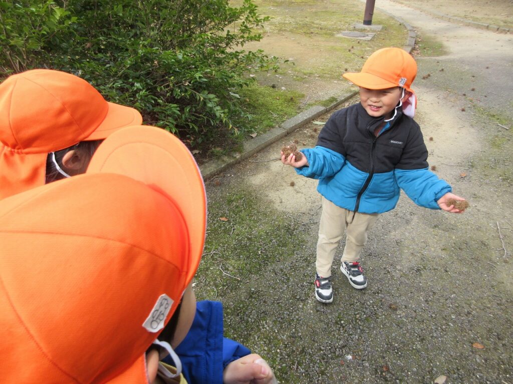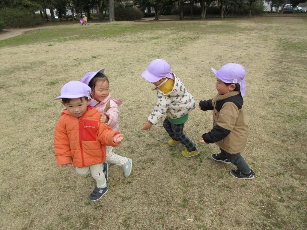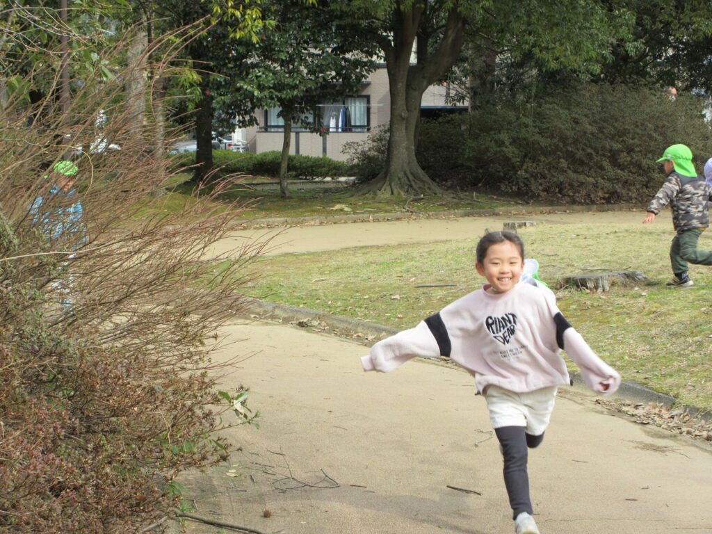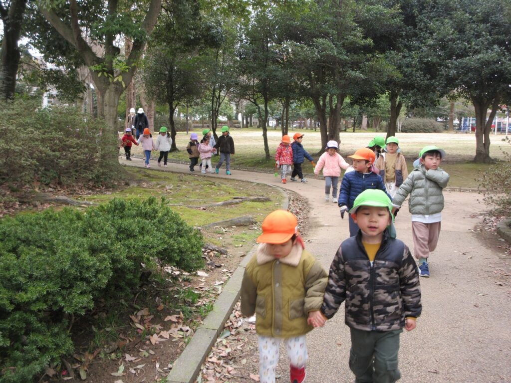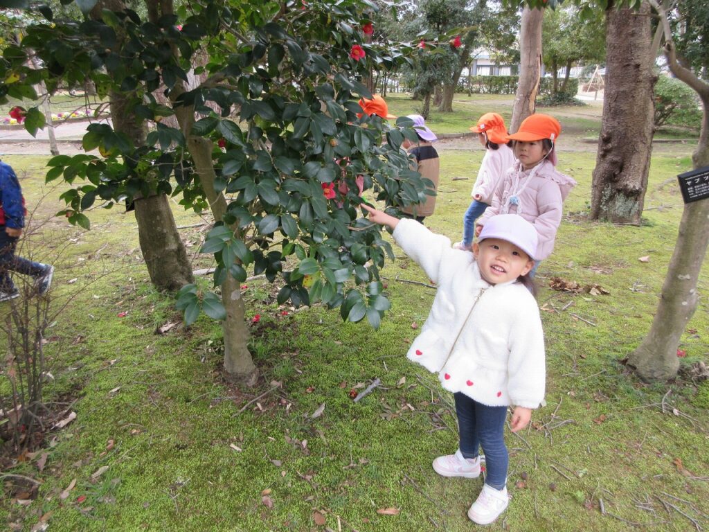 お散歩先の公園や道中には、梅の花が咲き始めていて春の訪れを感じさせてくれます。「ねぇ見て!昨日まではまだ蕾やったのに咲いてる!」「なんかお花のいい匂いがするね!」と指を指して教えてくれます。「あっ!これはタンポポ?」「葉っぱの形が丸だから違うんじゃないかな?」とお散歩中の会話も弾んでいます!足取りも軽く「今日はどんな発見があるのかな!」と生き生きしている子どもたちの姿に私たちも嬉しくなります♡