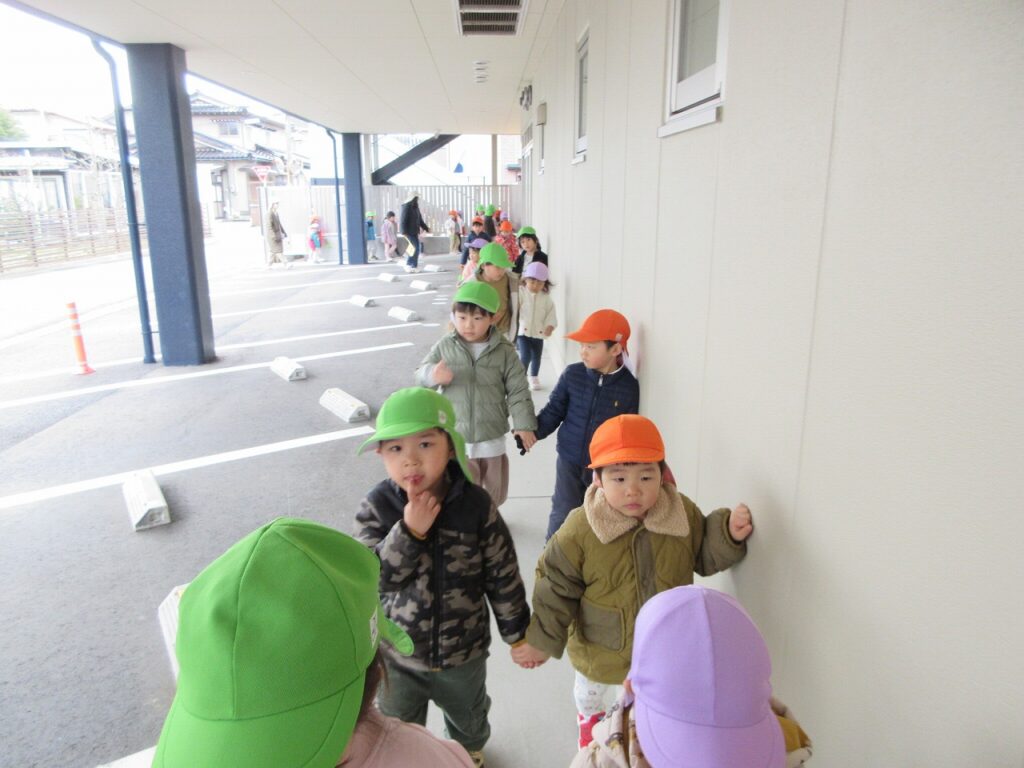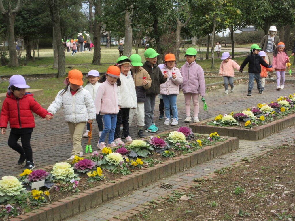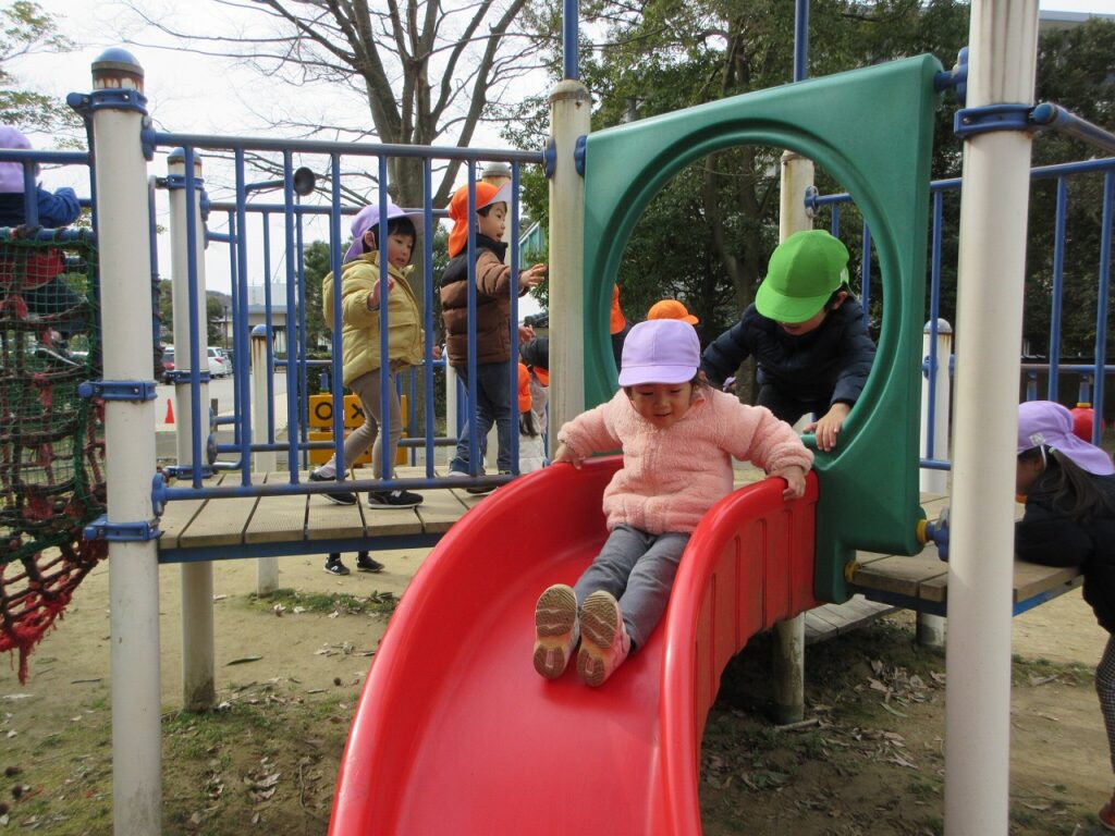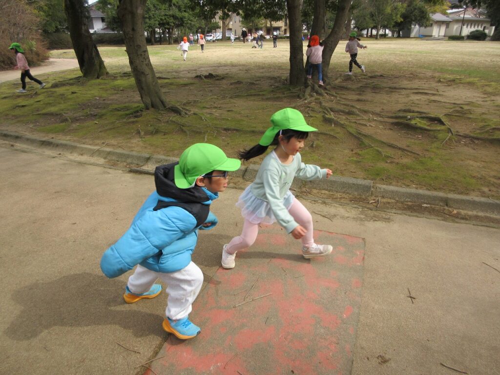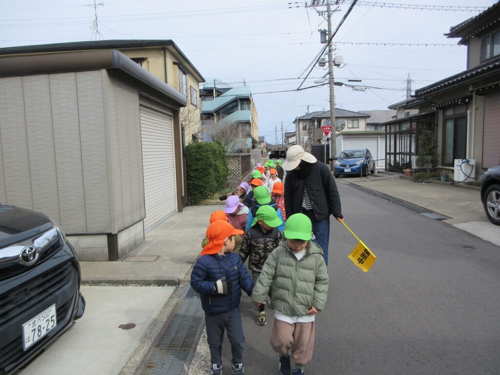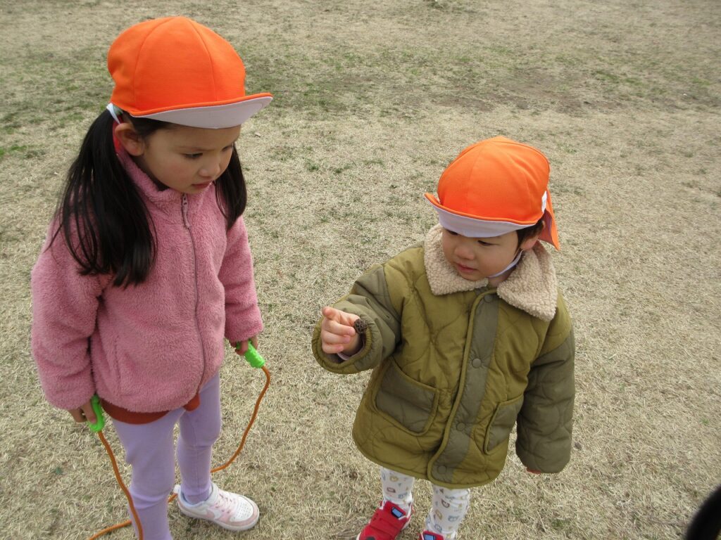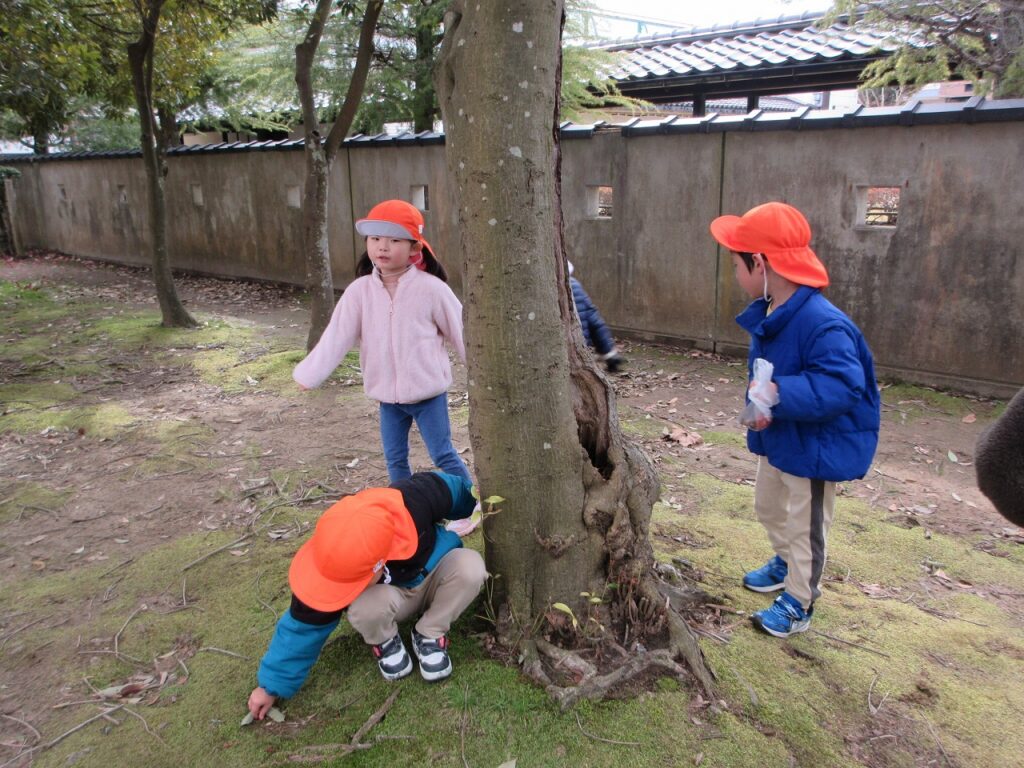 お散歩先の公園や道中には、梅の花が咲き始めていて春の訪れを感じさせてくれます。「ねぇ見て!昨日まではまだ蕾やったのに咲いてる!」「なんかお花のいい匂いがするね!」と指を指して教えてくれます。「あっ!これはタンポポ?」「葉っぱの形が丸だから違うんじゃないかな?」とお散歩中の会話も弾んでいます!足取りも軽く「今日はどんな発見があるのかな!」と生き生きしている子どもたちの姿に私たちも嬉しくなります♡
