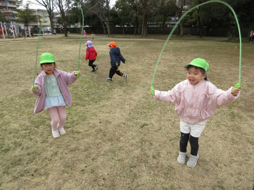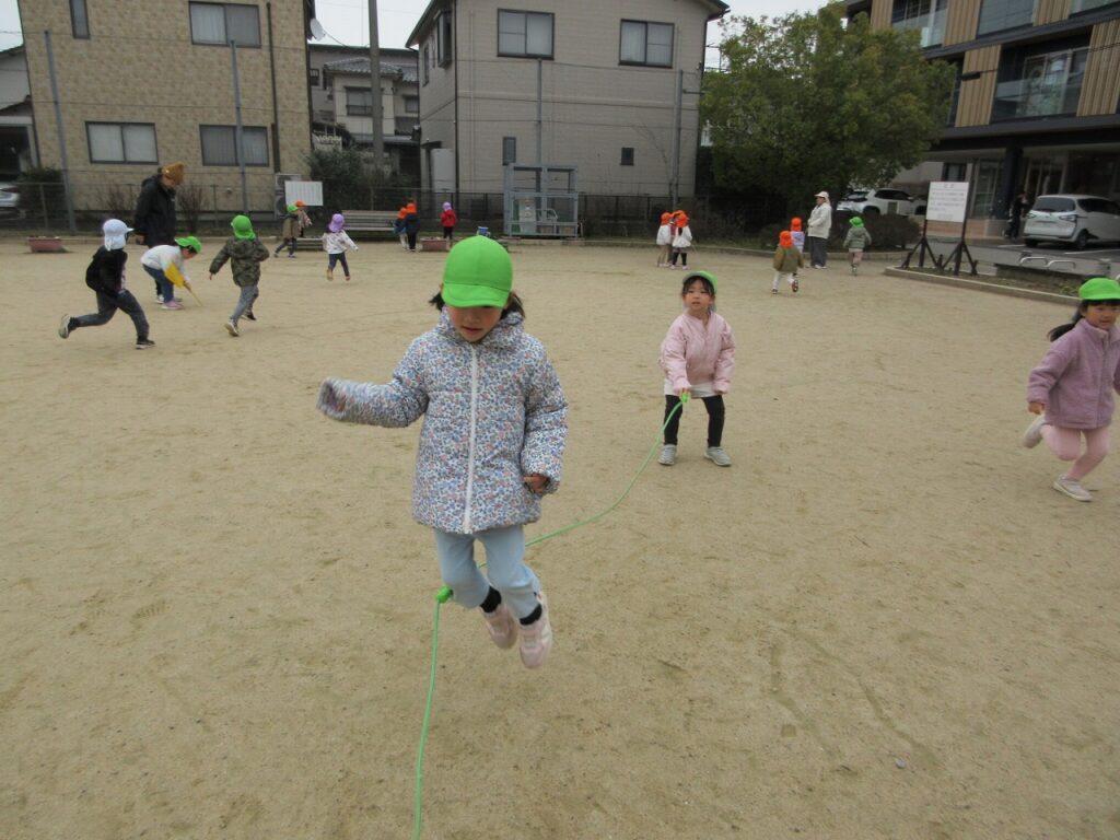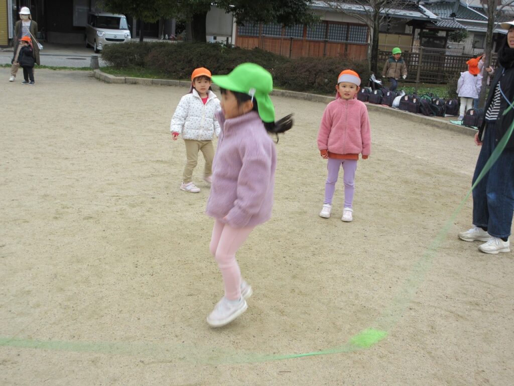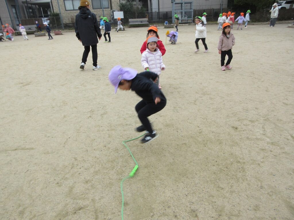 大縄跳びも大好きな子どもたち。「跳べる回数が増えたよ~!」と嬉しそうです。「真ん中で跳ぶといいんだよ!」「手も引っかからないようにね!」と応援も力になっているようです。