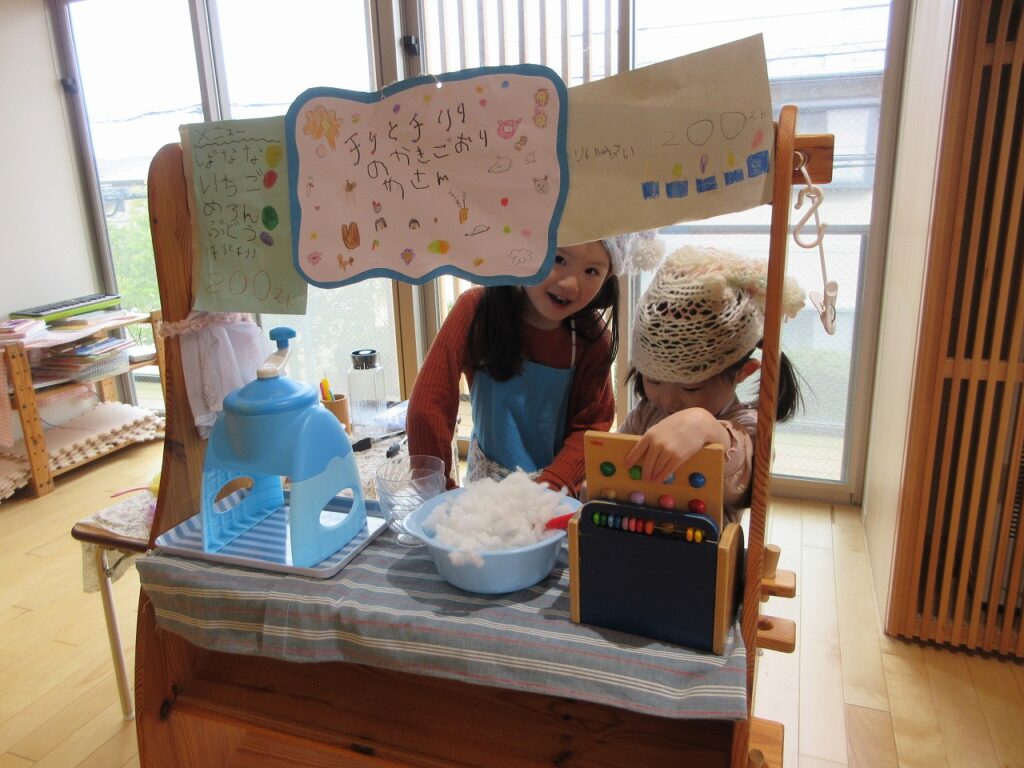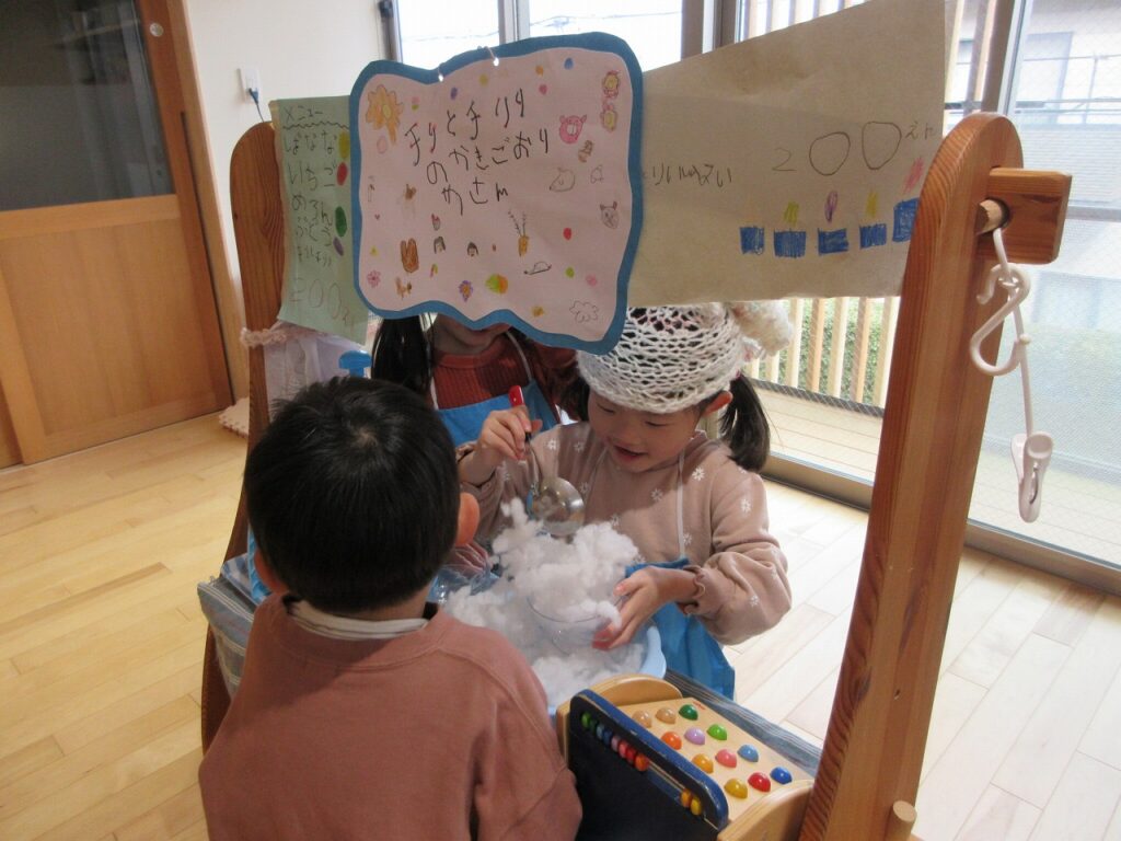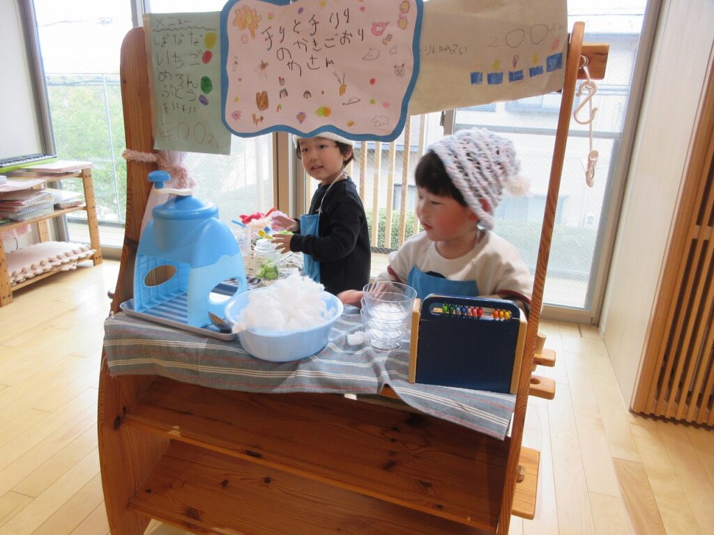 まだ雪も積もっていたある日「この雪山、かき氷みたいで食べたくなっちゃうね!」という声から、チリとチリリの世界の中で、『チリとチリリのかきごおりやさん』がオープン!味を決めるときにも果物だけでなく、ゆりぐみさんを中心に「チリとチリリ味ってどうかな~!」とグットアイデアが!「それいいね~!」とイメージを膨らませ、白雪を連想させる練乳味に決めました!