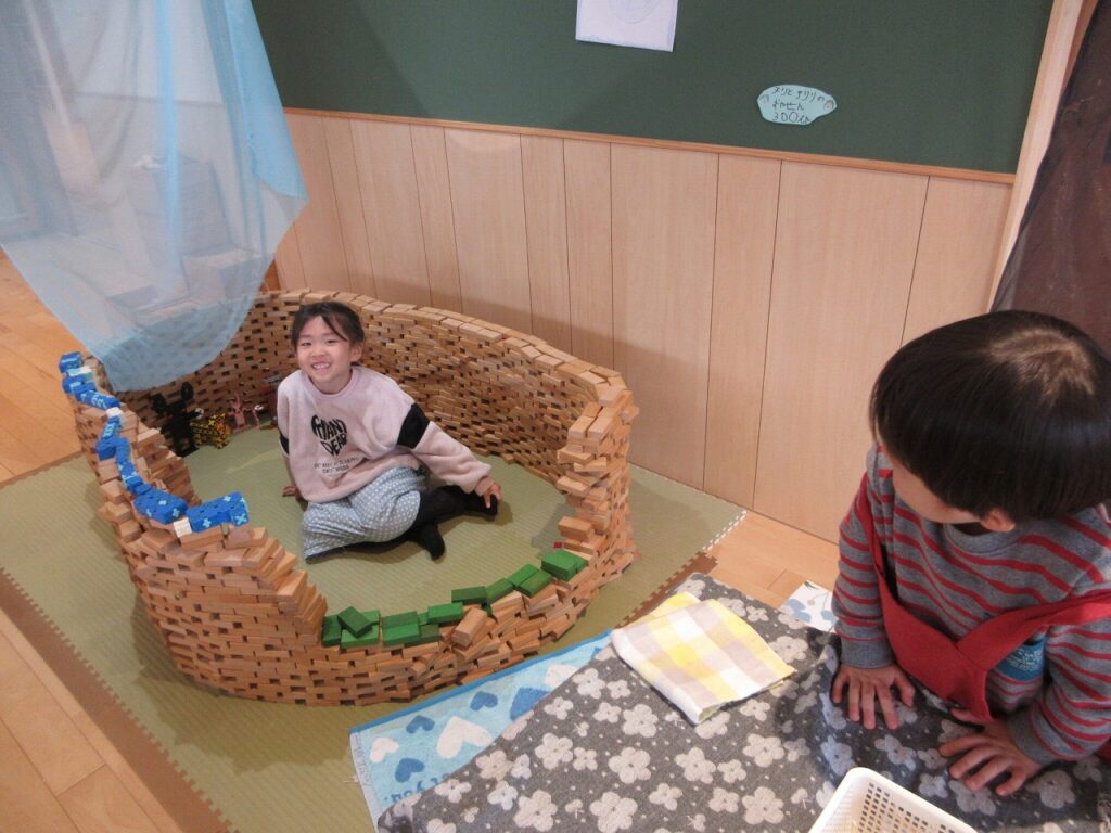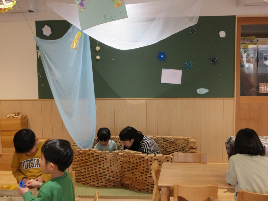 絵本の時間に読んだ『チリとチリリ ゆきのひのおはなし』の絵本から、りすぐみでもチリとチリリも浸かったような温泉を作ってみんながホッと一息休めるような場所にしたいねと話が広がり、白木の積み木を使って作ることに。形もこだわり、雪だるまの形に決定!とってもかわいい温泉になりました。少しずつ温かくなってきましたが、今でも人気は変わらず…!常連さんもいるほどなんです!お得な回数券もあったりしたら売れるかもしれませんね!