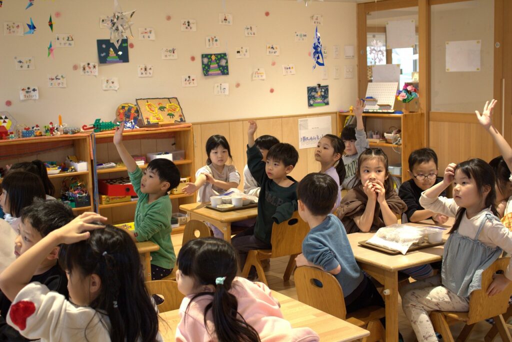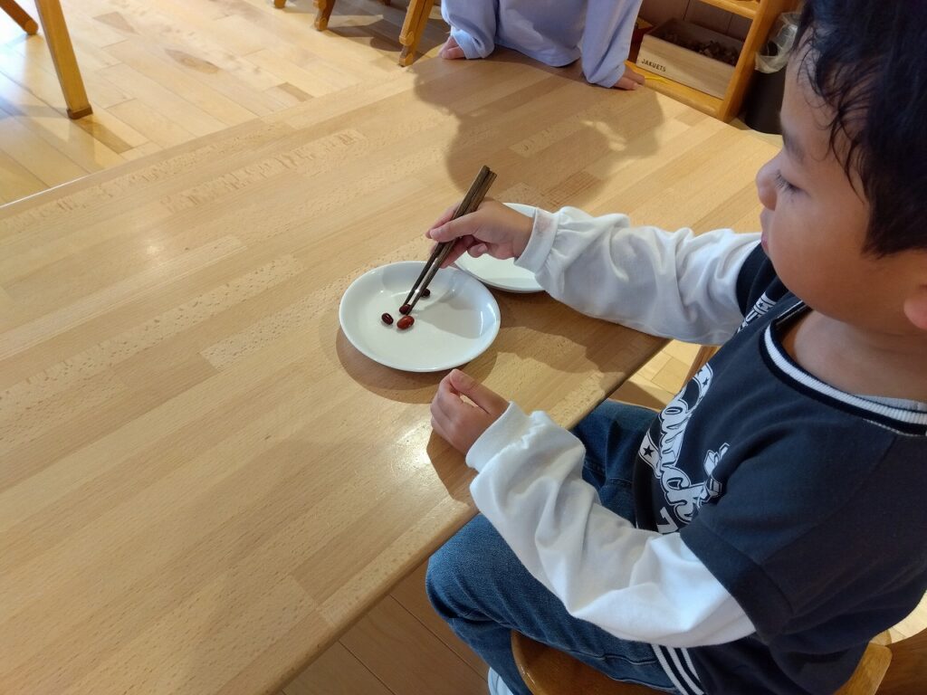 乾燥した小さな豆は、大人がつまむのも少しコツがいるものですが、子どもたちはなんのその。いつのまにか自分たちで「い~ち、に~」と速さを競い、ただつまむだけではない姿も見られました。少し箸が苦手な子も、周りのお友達に応援されながら、箸をゆっくり慎重に動かし、豆を移動させることができていました。