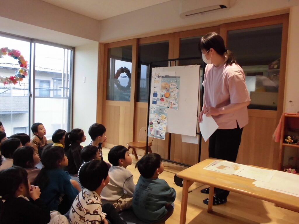 さくらさんを対象として毎月栄養士が直接食に関する話をしています。内容は季節の野菜の話や食事のマナー、身近な食材に関することや正しい包丁の使い方など、季節や時期にあった内容を話しています。