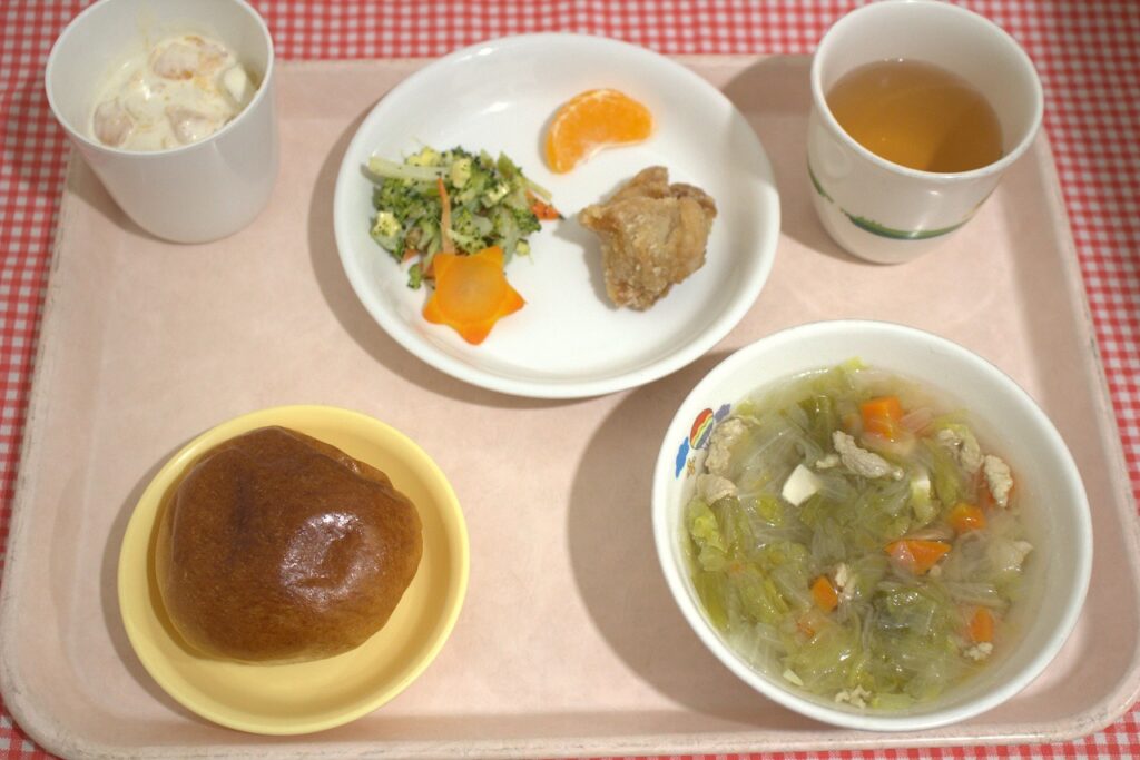 ロールパン フライドチキン にんじんの甘煮 ブロッコリーとチーズのゆかりマヨ和え 豚肉とレタスのスープ