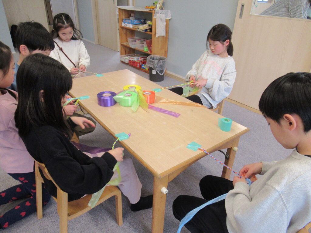 3月の遠足では久しぶりにみんなでしっぽ取りをしたいねと話になり、最近はお部屋で三つ編みに挑戦しながらしっぽ作りを取り組んでいます。