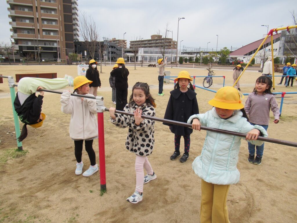 遊具の方では、鉄棒などに挑戦しながらできるようになった技なども見せてくれたり、子どもたち同士で「もっと足あげて!」とアドバイスを出し合いながら技ができるように頑張っています。